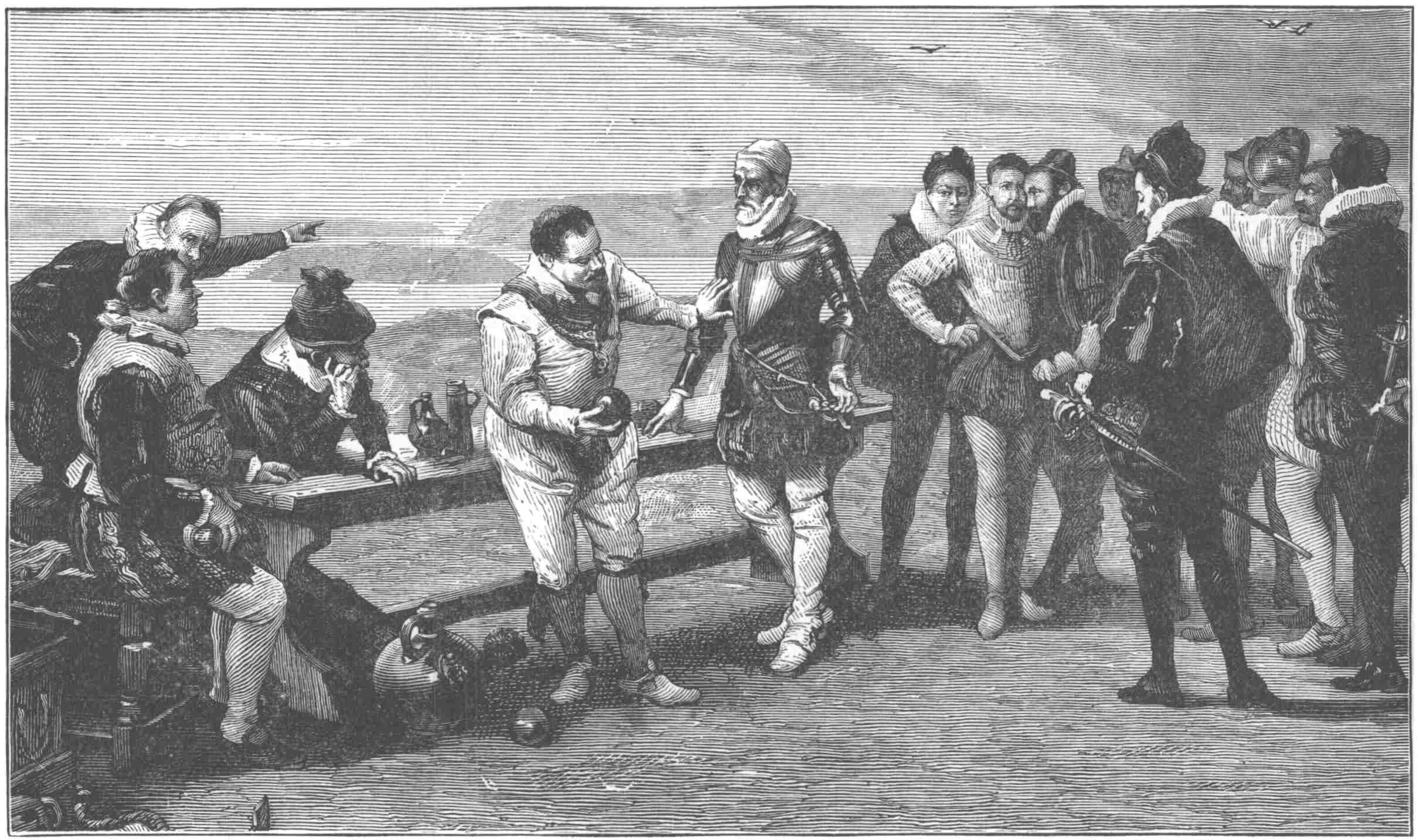 SIR FRANCIS DRAKE CALLS ON HIS COMRADES TO “PLAY OUT THE MATCH, FOR THERE IS PLENTY OF TIME TO DO SO, AND TO BEAT THE SPANIARDS TOO.”