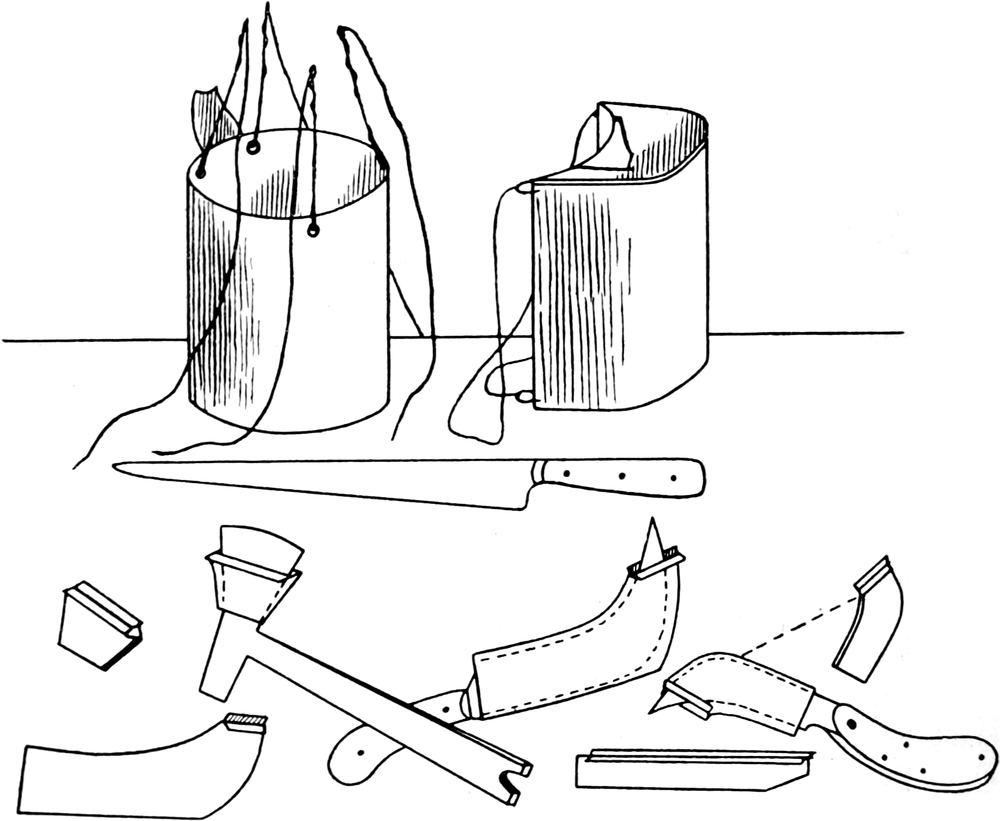 Da die Eingeborenen beim Anzapfen der Lianen und Bäume meist durch zu tiefes Einschneiden großen Schaden anrichten, ließ ich für die mitgenommenen Messer und Beile Scheiden anfertigen, welche ein zu tiefes Eindringen der Schneide in die Rinde verhüten sollten. Diese Scheiden waren aus starkem Blech hergestellt und konnten den betreffenden Instrumenten vor Gebrauch derselben aufgeschoben werden.