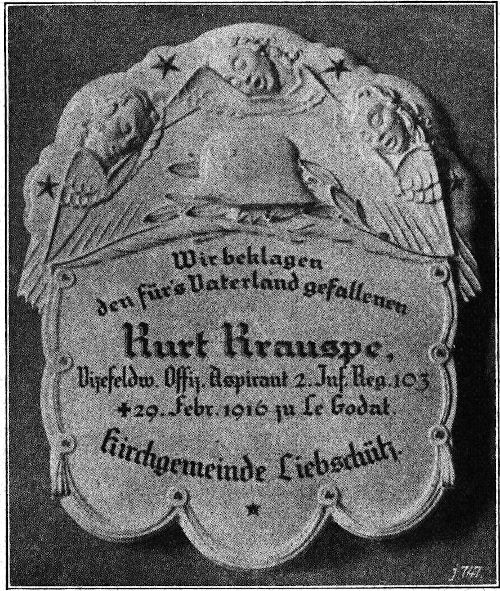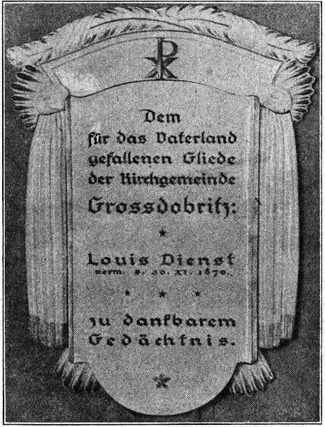 Gehen wir zunächst von den Kleinsten der hier vorgeführten, sämtlich vom Bildhauer Paul Börner stammenden Keramiken aus. Sie wurden für malerische Dorfkirchen geschaffen und in deren Innern an sorgfältig ausgewählter Stelle in die Architektur der Kirchenwände eingefügt. Während die für einen Gefallenen des Siebziger Krieges gewählte Tafel in der Großdobritzer Kirche (Abb. 1) wegen ihres strengen und trotz der geringen Größe monumentalen Ausdruckes hervorgehoben werden muß, erinnert das in der Liebschützer Kirche aufgehängte Ehrenzeichen (Abb. 2) mit seinen trauernden Engelköpfen an ältere Vorbilder[135] volkstümlicher Kunst. Es ist ein rührender Zug schlichter Liebe in dieser Weihetafel; das ist eben das Beste an diesen Schöpfungen, daß sie weit entfernt vom Reindekorativen und der Ausdruck eines inneren Erlebnisses sind.