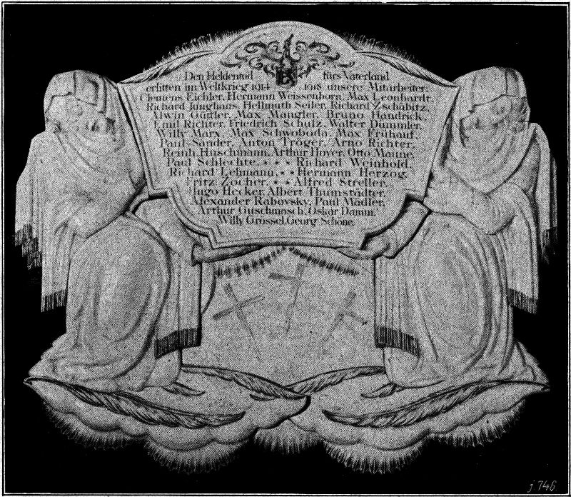 Nun aber zu der im ehrwürdigen Meißner Rathaus an bedeutungsvoller Stelle des Treppenhauses angebrachten Gedächtnistafel (Abb. 3) für die städtischen Beamten und Angestellten. Eine Schriftfläche von schöner Umrißlinie fügt sich formvollendet zwischen die Konturen der sie tragenden trauernden Frauengestalten. Ausdruck von Gesicht und Haltung, Faltenwurf und plastische Abtönung, alles klingt in prächtiger Harmonie zusammen. Trotz starker stilistischer Sonderart ist das Übertriebene, das wir oft an neueren Kunstwerken bedauern, vermieden. Komposition und Ausdruck, Ideeliches und Stoffliches halten sich die Wage.