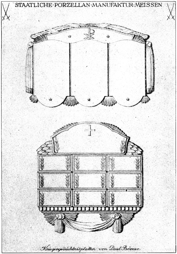 Aber auch im braunen Böttcherporzellan, dessen Wiederbelebung die Porzellanmanufaktur tatkräftig und mit schönem Erfolg fördert, wurden verschiedene Versuche angestellt. So wurde den im Kriege gebliebenen Arbeitern und Angestellten der Meißner Jutespinnerei eine derartige Tafel geschaffen. Etwas nüchtern und vielleicht etwas fabrikmäßig wird manchem die hierfür gewählte, streng geometrische Zusammenreihung von Namenstafeln erscheinen, aber das erfordert eben gerade der Organismus eines großen Industriewerkes, wo das Gefühlsmäßige zurückgedrängt, intimere Bildungen ausgeschlossen werden.