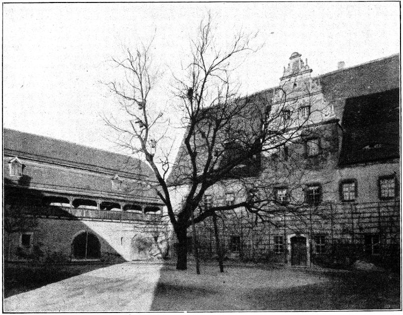 Gegenüber diesem Portal zum Lustgarten lag der jetzt leider verstümmelte Eingang zum Schloßhof. Wie er gestaltet war, das läßt sich nur mutmaßen aus dem im Torpfeiler vermauerten Schlußstein mit der immer wiederkehrenden Jahreszahl 1625. Der Blick in den Hof ist überaus erfreulich. Breitästig steht ein schöner alter Nußbaum in seiner Mitte. Links, das Wirtschaftsgebäude mit seinen großen Toren barg wohl dereinst Rosse und Wagen, darüber zieht sich eine reizvoll ausgebildete Holzgalerie. Der Hof wird beherrscht von dem Treppenturm, der sich an den einen Flügel des Schlosses – wohl ursprünglich dem eigentlichen Wohnflügel – anlehnt. Nach der äußeren und inneren Gestaltung des Treppenturmes möchte ich auch ihn dem Umbau der Jahre 1625 bis 1626 zuschreiben. Wo dereinst die alte Uhr die Stunden kündete, hat nun ein Wasserbehälter zu Nutz und Frommen der Schloßbewohner seinen Platz gefunden.