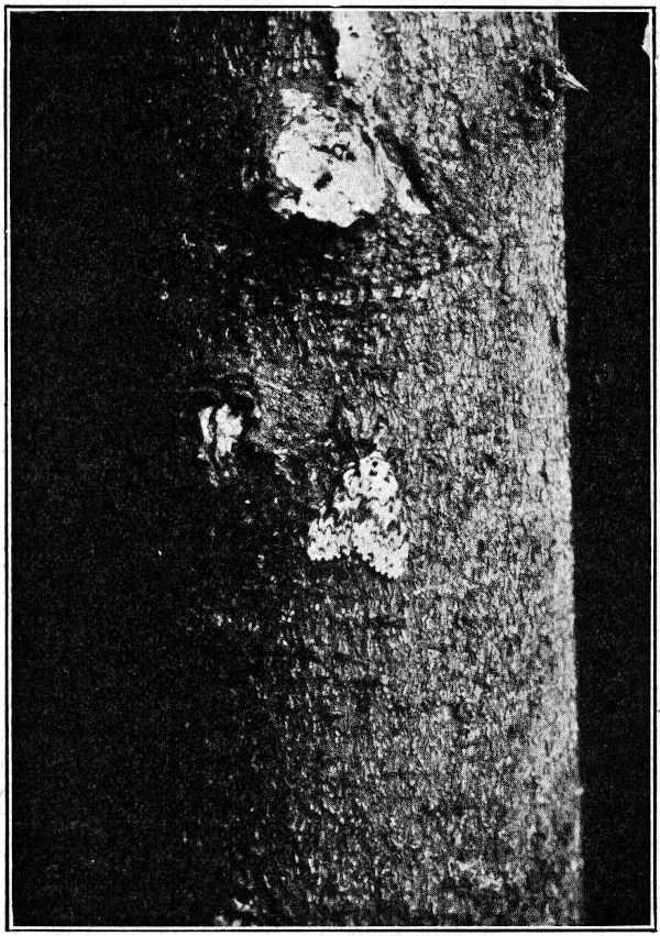 Zum besseren Verständnis der Abbildungen 2 und 3 sei noch folgendes hinzugefügt: die im Frühjahr aus den Eiern ausgeschlüpften Räupchen sitzen zunächst einige Tage dicht gedrängt in sogenannten Spiegeln beisammen, ehe sie den Aufstieg in die Baumkronen beginnen. Bei ihren Wanderungen spinnen sie ununterbrochen ihre feinen Fäden, die sie auf den Unterlagen stellenweise festheften, so daß zuletzt feinste schleierartige Gespinste entstehen. Diese Gespinste werden um so dichter, je mehr Räupchen denselben Weg nehmen. Das ist namentlich unter den Leimringen der Fall, unter denen sich schließlich gewaltige Mengen von Spiegelräupchen ansammeln, die immer spinnend rastlos den Stamm umwandern, am Leimring, den sie nicht überschreiten können, sich an einen Gespinstfaden fallen lassen, um dann denselben Weg ruhelos zu wiederholen, bis sie schließlich an Nahrungsmangel zugrunde gehen.
