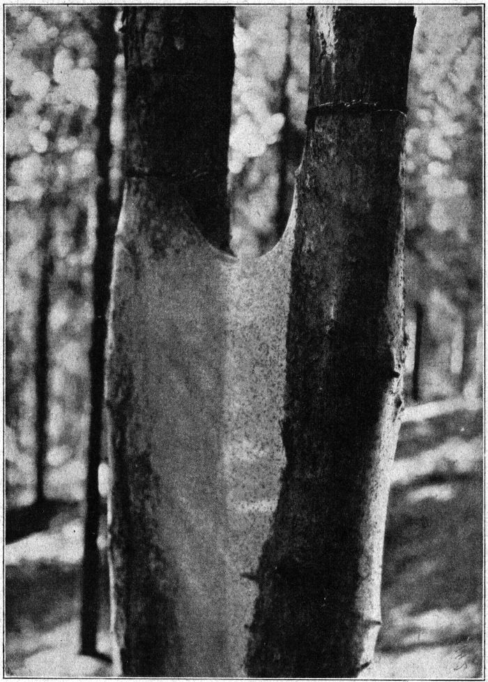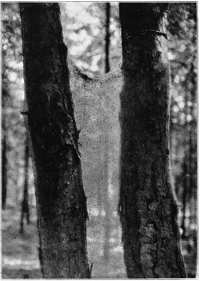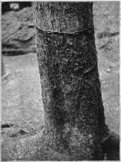 Als letztes uns zu Gebote stehendes Mittel bliebe nur noch der viel umstrittene Leimring zu besprechen. Seine Wirkung ist eine doppelte. Zunächst fängt er alle unterhalb des Leimringes aus den Eiern gekommenen Spiegelräupchen, die zum Fraße in die Baumkronen hinaufsteigen wollen, ab, und verurteilt sie zum[193] Hungertode. Wer in der Sächsischen Schweiz in diesem Frühjahre derartige geleimte Bestände besichtigt hat, wird bestätigen können, daß durch die Leimringe schon in einem einzigen geleimten Bestande Millionen und Milliarden von Räupchen vernichtet worden sind, bevor sie irgendwelchen Schaden anrichten konnten. Die Abbildungen 2 und 3 geben davon ein anschauliches Bild. Da man nun damit rechnen kann, daß etwa die Hälfte der Raupen sich zu weiblichen Faltern entwickelt haben würden, so sind für das nächste Jahr ebensoviel eierablegende Weibchen, die man beim Sammeln im Falterzustande in gleichem Maße niemals gefangen hätte, mit vernichtet worden.