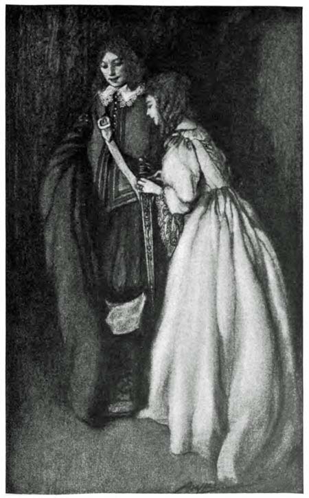 I was at her heels as she ran across the little court and plunged into a dark doorway beyond. I paused an instant to draw my sword, dropping my cloak that it might not cumber me, and then clattered up the stair behind her. It was dark and narrow and of many turnings, so that she, who knew the place, had reached the top while I was stumbling along midway, cursing the darkness. But she awaited me, and as I reached her side held out her hand to[15] me. My own closed over it in an instant and found it soft and warm and trembling. Here was an adventure after my own heart, and I had had so few adventures!