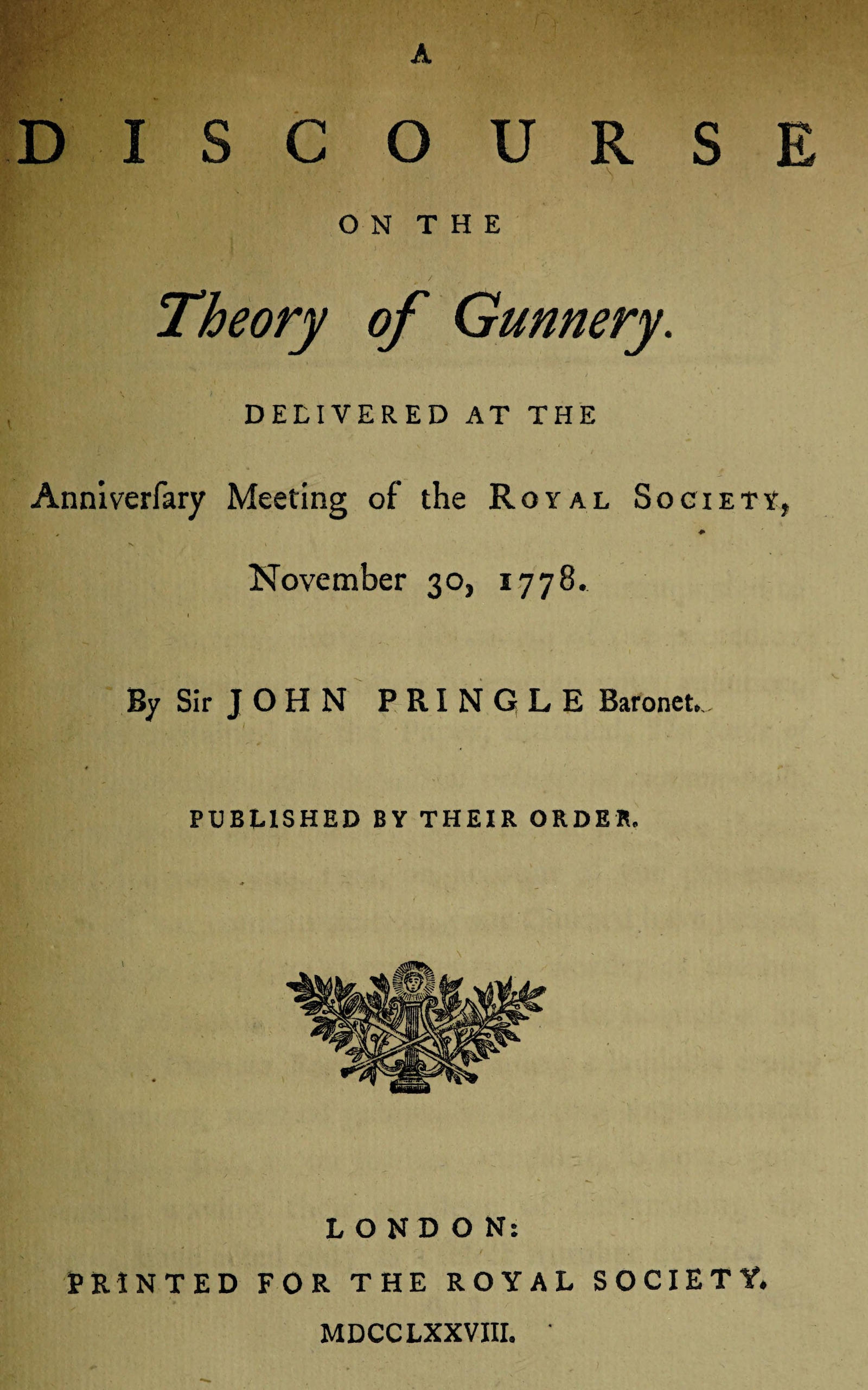 Among the several experiments communicated to the society, during the course of the preceding year, none seeming so much to engage your attention, as those contained in the Paper, intituled, The force of fired gun-powder, and the initial velocity of cannon-balls, determined by experiments: with much pleasure therefore I acquaint you, that, on account of the pre-eminence of that communication, your Council have judged the author, Mr. Charles Hutton, worthy of the honour of the annual medal, instituted on the bequest of Sir Godfrey Copley Baronet, for raising a laudable emulation among men of genius, in making experimental inquiries. But, as on former occasions, so now, your Council, waving their privilege of determining the choice, have acted only as a select number deputed by[4] you, to prepare matters for your final decision. I come then, on their part, briefly to lay before you the state of the Theory of Gunnery, from its rise to the time when its true foundation was laid, in order to evince how conducive those experiments may be to the improvement of an art of public concern, as well as to the advancement of natural knowledge, the great object of your institution. And if, upon a review of the subject, you shall entertain no less favourable an opinion of Mr. Hutton’s performance, than what your Council have done, it is their earnest request that you would enhance the value of this prize, by authorizing your President to present it to our ingenious brother in your name.