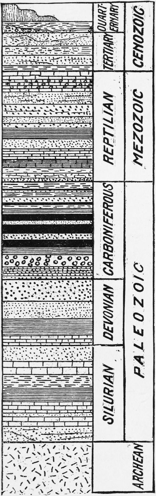 That period in the history of the earth’s crust[3] before stratification began is known as Archean time. This was followed by the period known as Paleozoic time, which is divided into three ages. The first is the age of Invertebrates. It was during this age that life made its advent on the earth. The waters were the first to bring it forth, but before the close of the age it began also to appear on the land, in isolated spots, in the simplest forms of vegetation. The next age is known as the age of Fishes, during which vegetable life became more varied and abundant, winged insects floated in the air, and great sharks and gars swam in the seas. Then came the Carboniferous age or age of Coal Plants, in which vast areas of what are now the Middle, Southern, and Western States were covered with low marshes and shallow seas, and were rich and rank with multitudinous forms of vegetation. But these marshes were again and again submerged and covered with material washed up by the waves before the final subsidence of the waters left them as a continuing portion of the dry land. It was at the close of the Carboniferous age that great disturbances took place in the earth’s crust. Before this the rock strata had been comparatively level; now they were folded, flexed, broken, rounded into hills, pushed resistlessly up into mountain ranges. It was at this time that the upheaval of the great Appalachian Range in North America took place. Following this came Mesozoic time, which had[4] but one age, the age of Reptiles. It was during this age that the type of reptiles reached its culmination. The land generally brought forth vegetation, though not with the prolific richness and luxury of the Carboniferous age. Birds, insects, and creeping things were abundant, and monsters of the saurian tribe swam in the seas, roamed through the marshes, crawled on the sandy shores, and took short flights through the air. The last great division is known as Cenozoic time, and covers two ages, the age of Mammals and the age of Man. It was during the mammalian age that trees of modern types, such as oak, maple, beech, etc., first made their appearance, and mammalian animals of great variety and size, both herbivorous and carnivorous, roamed through the forests. True birds flew in the air, true snakes crawled upon the ground, and in the waters were whales and many kinds of fishes of the present day. But the marine monsters and the gigantic and ferocious saurians of an earlier age had disappeared. So the world became fitted to be the dwelling-place of the human race. Then began the age of Man, an age which is yet not complete.