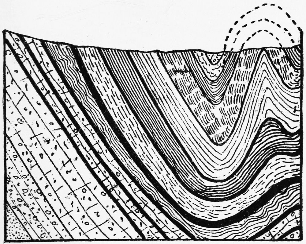 A brief review of the geological history of the earth’s crust will be of prime importance, and it will not be inappropriate to go back to the origin of the earth itself. But no man can begin at the beginning; that is too far back in the eternal mists; only the Infinite Mind can reach to it. There is a point, however, to which speculation can journey, and from which it has brought back brilliant theories to account for the existence of the planet on which we live. The most philosophic of these theories, as it certainly is the most popular, is the one known as the Nebular Hypothesis, propounded by Laplace, the great French[2] astronomer, in 1796. This theory accords so well with the laws of physics, and with the human knowledge of the age, that most of the great astronomers have adopted it as the best that has been given to us, and the world of science may be said to have accepted it as final. Let us suppose, then, in accordance with this theory, that our earth was, at one time, a ball of liquid fire, revolving on its axis, and moving, in its orbit, around the parent sun with the motion imparted to it in the beginning. As cooling and condensation went on, a crust was formed on its surface, and water was formed on the crust. The waters, however, were no sooner spread out than they were tossed by the motion of the atmosphere into waves, and these waves, by constant friction against the rock crust of the earth, wore it down into pebbles, sand, and mud. The silt thus made being washed up on to the primitive rock and left there by the receding waters became again as hard and firm as before. Occasionally a subsidence, due to the contraction of the earth’s body, would take place and the sea would again sweep over the entire surface, depositing another layer of silt on the one already formed, or possibly washing that again into sand and pebbles. This process continued through an indefinite period of time, forming layer upon layer of stratified rock, or excavating great hollows in the surface already formed.