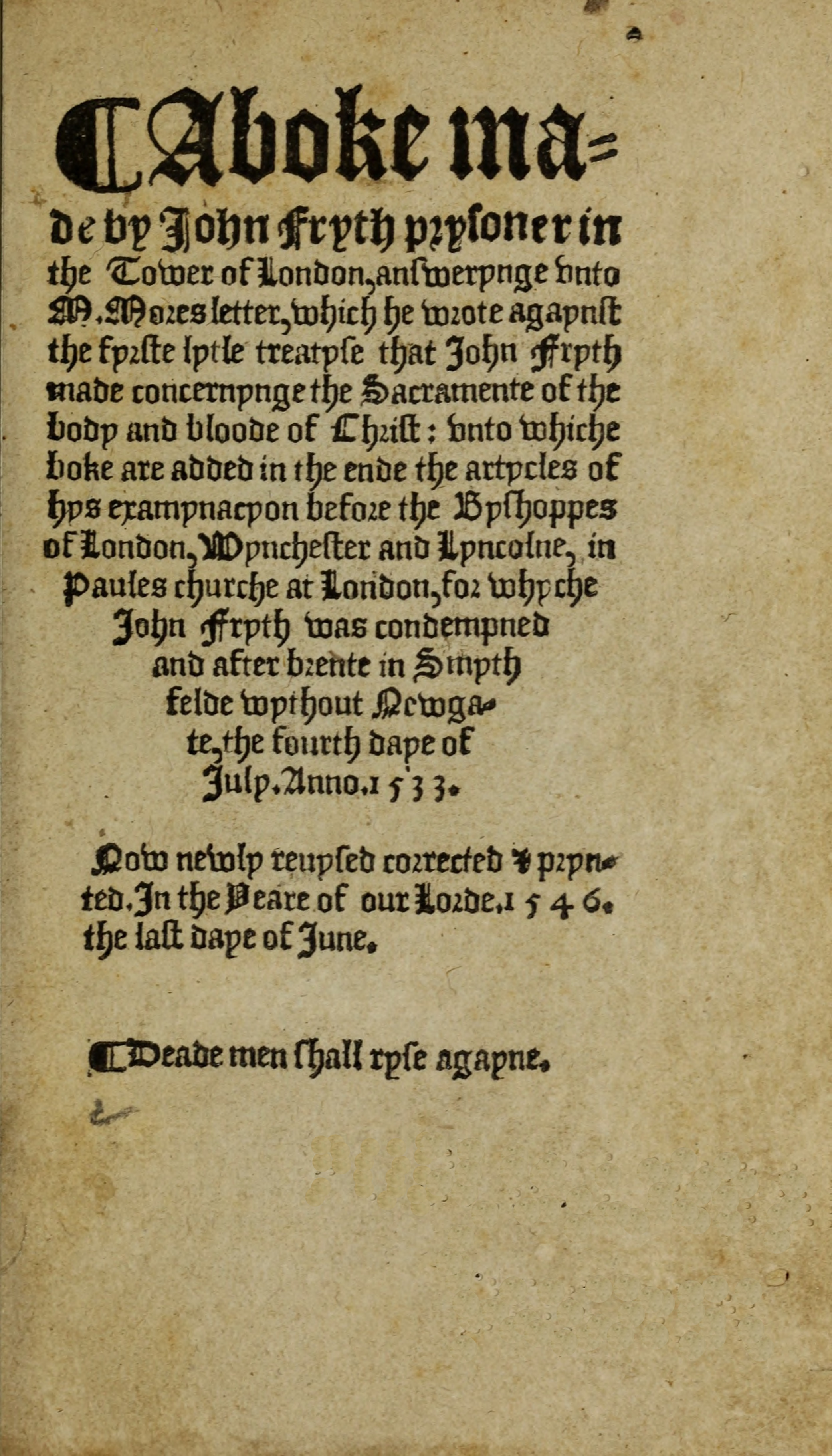 Title: A boke made by John Fryth prysoner in the Tower of London: answerynge unto M. Mores letter, which he wrote agaynst the fyrste lytle treatyse that John Fryth made, concernynge the sacramente of the body and bloude of Christ