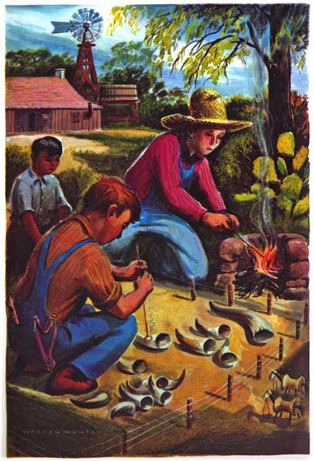 Warren Hunter, one of Texas’ outstanding artists, has provided striking illustrations that catch the spirit of the stories and recall days quite remote from the modern scene, yet separated from us by only a few decades.