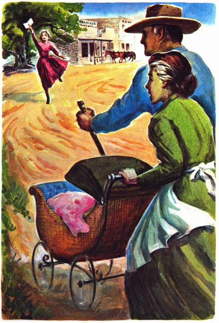 [20]The post office was about four blocks away. As she tore out, Mama and Papa followed as rapidly as they could, pushing the baby buggy. There was no pavement to roll it over. The streets were sandy and gullied, but the baby buggy was more than halfway to the post office when Elizabeth met it coming back. She was running, hand stretched out holding a letter that had already been torn from the envelope.