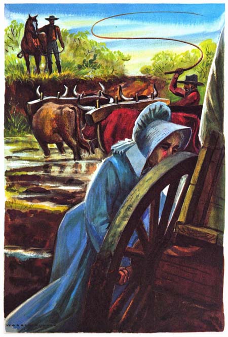 At last they were only six miles from home. Christmas was only three days away. Then the oxen stalled in a mudhole at the crossing on La Parra Creek. For an hour Mr. Cude struggled and worried with them, trying to make them make the supreme pull. Mrs. Cude threw all her strength on the spoke of one wheel. Finally Mr. Cude began the weary business of unloading some of the freight and carrying it on his back out of the creek.