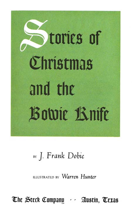 In wanting to bring you a distinctively different Christmas greeting for 1953—as well as one that is typically Texan—The Steck Company turned quite naturally to Texas’ most distinguished folklorist, J. Frank Dobie. His writings of the past quarter century have turned the attention of people in many lands to the rich folklore of the Southwest. Dobie’s recollections of three boyhood Christmases begin this volume. As an added fillip, his colorful story of the Bowie knife is included.