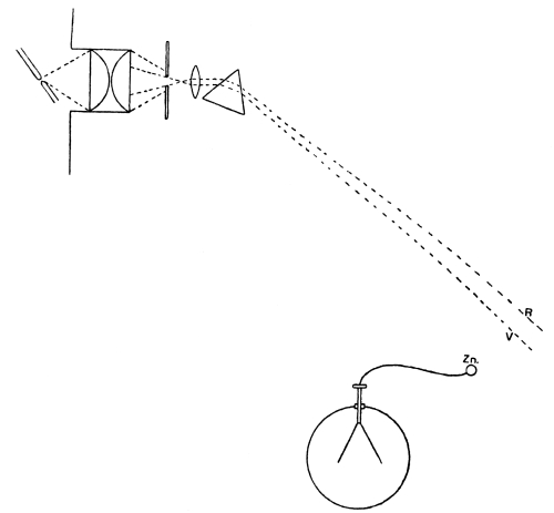 [4] While preparing for the lecture it occurred to me to try, if possible during the lecture itself, some new experiments on the effect of light on negatively charged bits of rock and ice, because if the effect is not limited to metals it must be important in connection with atmospheric electricity. When Mr. Branly coated an aluminium plate with an insulating varnish, he found that its charge was able to soak in and out of the varnish during illumination (Comptes Rendus, Vol. CX., p. 898, 1890). Now the mountain tops of a negatively charged earth are exposed to very ultra-violet rays, and the air is a dielectric in which quiet up-carrying and sudden downpour of electricity could go on in a manner not very unlike the well-known behaviour of water vapour; and this perhaps may be the reason, or one of the reasons, why it is not unusual to experience a thunderstorm after a few fine days. I have now tried these experiments on such geological fragments as were handy, and find that many of them discharge negative electricity under the action of a naked arc, especially from the side of the specimens which was somewhat dusty, but that when wet they discharge much less rapidly, and when positively charged hardly at all. Ice and garden soil discharge negative electrification, too, under ultra-violet illumination, but not so quickly as limestone, mica schist, ferruginous quartz, clay, and some other specimens. Granite barely acts; it seems to insulate too well. The ice and soil were tried in their usual moist condition, but, when thoroughly dry, soil discharges quite rapidly. No rock tested was found to discharge as quickly as does a surface of perfectly bright metal, such as iron, but many discharged much more quickly than ordinary dull iron, and rather more quickly than when the bright iron surface was thinly oiled or wetted with water. To-day (June 5, 1894) I find that the leaves of Geranium discharge positive electrification five times as quickly as negative, under the action of an arc light, and that glass cuts the effect off while quartz transmits it. (For Elster and Geitel’s experiments, and those of Righi, see Appendices, p. 115 et seq.)