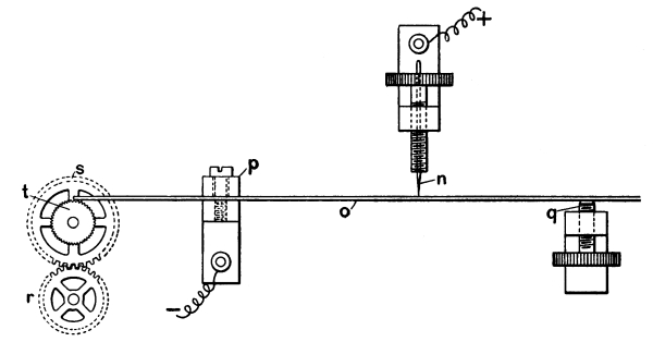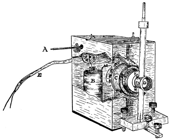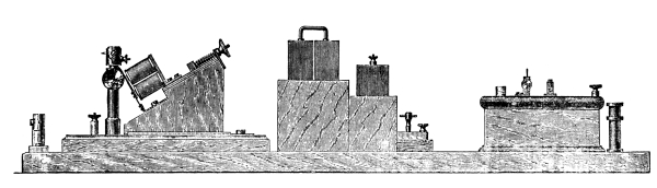 [17] Cf. Trouton, in Nature, Vol. 39, p. 393; and many optical experiments by Mr. Trouton, Vol. 40, p. 398. Since then the above described and depicted apparatus for electro-optic experiments has been imitated in a neat, compact form by Prof. J. Chunder Bose, of Calcutta, and with it he has obtained many admirable and interesting optical results. See Proc. Roy. Soc.