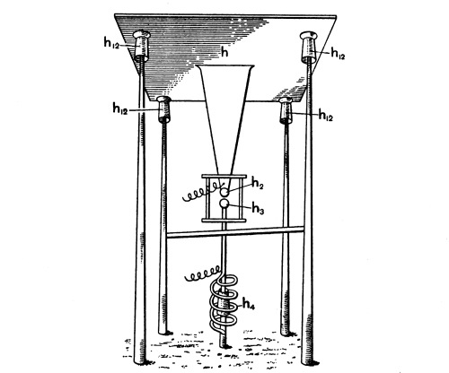 While trying to re-establish syntony between primary and secondary, I found that the period of the resonator was considerably increased by the cylinders 2-4, but that the maximum spark length was much diminished. With the cylinders Nos. 5-9 in the spiral, it was no longer possible to establish syntony, “a fact which is certainly due to their considerable absorption of energy. Take, for example, cylinder 9: electromagnetic energy must converge rapidly towards it in order to be transformed, and the space finds itself empty of energy as air is exhausted of vapour in presence of an absorbing substance.”