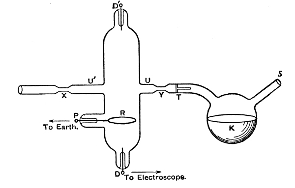 (i) If radiation falls on an insulated metal plate connected with an electrometer, in an enclosure of the same metal, the positive electrification shown by the deflection of the electrometer is greater as the plate is further from the walls of the enclosure. The action stops when the metal has attained a certain electric density, constant for a given metal; so the potential of a plate is naturally higher as its capacity is less. It is thus established that radiation acts on the particles of gas in contact with a conductor; they go away with a negative charge, leaving plus on the conductor, until an electric density sufficient to balance this action is attained.