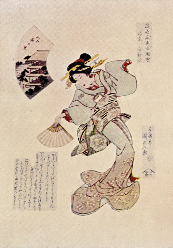 The “Kinsei jibutsu-Kō” (近世事物考 Reflections about modern things) says:—the higher priced women of the Shin Yoshiwara are now called “oiran” The reason for giving them this name is that in the era of Genroku (1688–1703) the courtesans of the Yoshiwara all planted a large number of trees in the Naka-no chō (central street). About this time a Kamuro (female page) attached to a certain house called the “Kishida-ya” wrote a stanza of poetry which ran:—