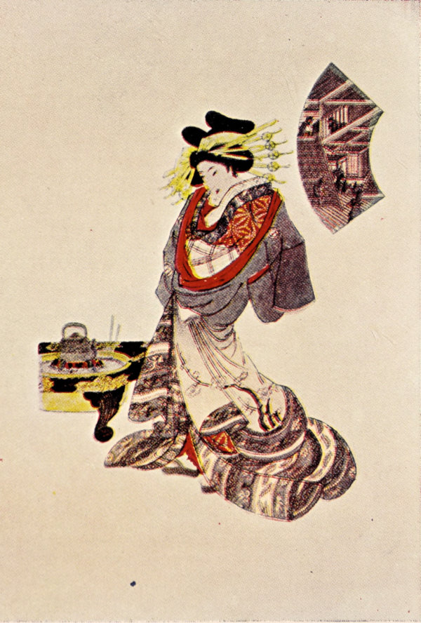 This poem, which the little Kamuro so proudly wrote, is a proof that the word oira (“I,” or in connection with no or ga “my” or “mine”) had been corrupted to oiran in the Yoshiwara. It would therefore appear that the present word oiran, which is universally used, arose from the fact that the attendants of courtesans anciently spoke of them as “oiran” (oira no ane = my elder sister).”
