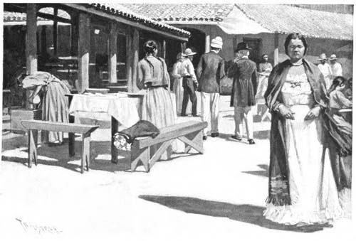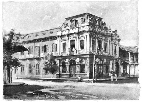 There are three great buildings in Caracas—the Federal Palace, the Opera-house, and the Pantheon, which was formerly a church, and which has been changed into a receiving-vault and a memorial for the great men of the country. Here, after three journeys, the bones of Bolivar now rest. The most interesting of these buildings is the Federal Palace. It is formed around a great square filled with flowers and fountains, and lit with swinging electric lights. It is the handsomest building in Caracas, and within its four sides are the chambers of the upper and lower branches of the legislature, the offices of the different departments of state, and the reception-hall of the president, in which is the National Portrait Gallery. The palace is light and unsubstantial-looking, like a canvas palace in a theatre, and suggests the casino at a French watering-place. It is painted in imitation of stone, and the statues are either of plaster-of-paris or of wood, painted white to represent marble. But the theatrical effect is in keeping with the colored walls and open fronts of the other buildings of the city, and is not out of place in this city of such dramatic incidents.