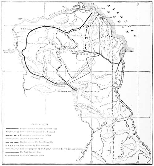 [276]They will, however, probably understand better what the Monroe Doctrine really is before their boundary dispute with Great Britain is settled, and Great Britain will probably know more about it also, for it is possible that there never was a case when the United States needed to watch her English cousins more closely than in this international dispute over the boundary-line between Venezuela and British Guiana. If England succeeds it means a loss to Venezuela of a territory as large as the State of New York, and of gold deposits which are believed to be the richest in South America, and, what is more important, it means the entire control by the English of the mouth and four hundred miles of the Orinoco River. The question is one of historical records and maps, and nothing else. Great Britain fell heir to the rights formerly possessed by Holland. Venezuela obtained by conquest the lands formerly owned by Spain. The problem to be solved is to find what were the possessions of Holland and Spain, and so settle what is to-day the territory of England and Venezuela. Year after year Great Britain has pushed her way westward, until she has advanced her claims over a territory of forty thousand square miles, and has included Barima Point at the entrance to the Orinoco. She has refused positively,[277] through Lord Salisbury, to recede or to arbitrate, and it is impossible for any one at this writing to foretell what the outcome will be. If the Monroe Doctrine does not apply in this case, it has never meant anything in the past, and will not mean much in the future.