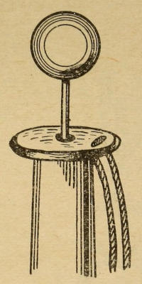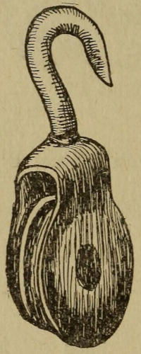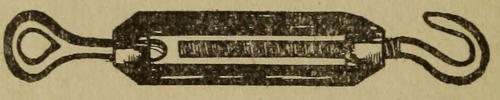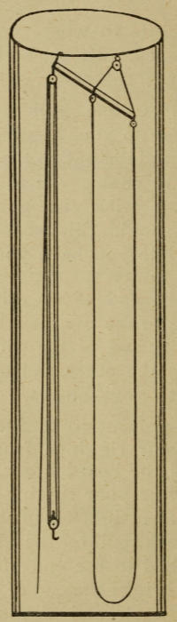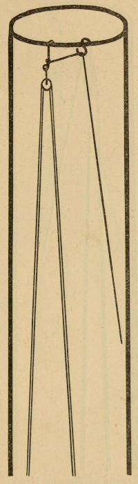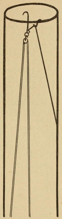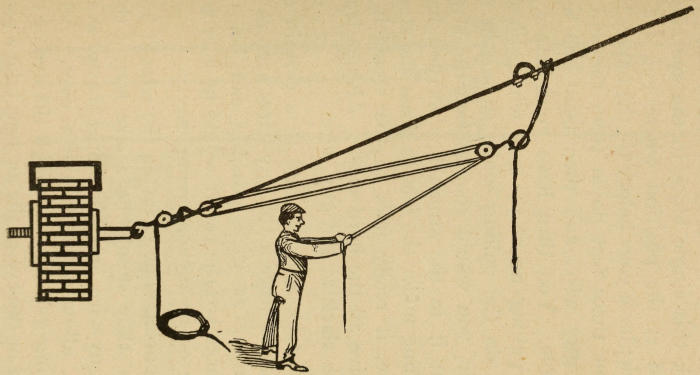 When this is done, pull on the wire; that will draw up your riggings, reaving your block and falls out to the size of the stack, so as to enable you to keep them from twisting with the gimblet wire. Now, then, should this board be weak and break while you have your riggings near the top, to prevent them from falling down and one end of the gimblet wire from running to the top, tie a heavy piece of cord to the end of the gimblet wire, running it to the other end of the wire, then fasten to your blocks.