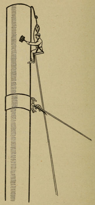 Stand along the side of the stack, throwing your head to one side and looking up, allowing your eyes to follow the stack and the clouds, shaking the head at different times. This brings on dizziness. Then stand erect, so as to clear your head. After getting into the boatswain chair, you place the fall line of your riggings—that is, the line with which you draw yourself up—between your legs. This enables you and your helper to pull more steadily together, and you get to the top much quicker.