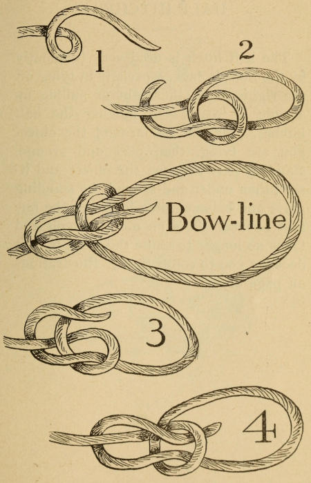 In making the bow-line knot follow the illustrations according to numbers. In No. 1 the rope is formed in a bight; pass No. 1 through the bight under then over and then under, as illustrated in No. 2; then over and down through the bight as illustrated in Nos. 3 and 4. Draw tight as illustrated on page 63.