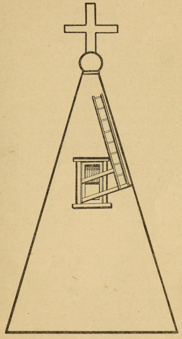 For the majority of church jobs an extension ladder is the handiest article. After drawing the extension ladder up to what is known to the Jack as the pigeon hole window in the church spire, build your platform from the window with 3×4 lumber, extending it out some six feet; lower a line down on both sides of the window, having your helper tie the two ends together around the lower section of the spire. Then by drawing it to the window you will have your first loop around the steeple. Place the extension ladder on the platform; nail two boards to the inside of the window, then attach other ends of boards to the ladder. Use all the safety devices available when going out on the ladder. Lash the ladder[76] wherever it is possible and also yourself by placing a line under the arms and tying the line that you have around the spire, working it up as far as you can go, then lash this to the ladder so as to keep the ladder from swaying to the left or right.