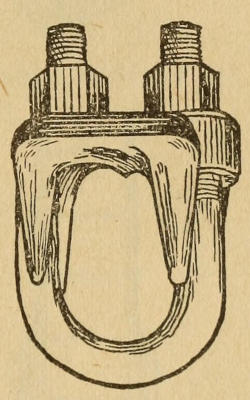 Look over your guy wires and pick out the most solid of the lot running to the top band. Make sure of its anchorage. There are supposed to be two clips at each end of a guy wire where it is connected to the turn-buckle, and at the band place the double block without the stack hook on the guy wire.