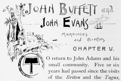 John Buffett, also, who so nobly volunteered to shut himself off from all the fascinations that the world may have contained for him, and chose to cast in his lot with a community so insignificant and so remote, that he might help John Adams in his declining days, in the arduous duties and heavy responsibilities that the rearing of a youthful colony necessitates, passed away in May, 1891, having nearly completed a century of years. He also left numerous descendants behind him; all his children, consisting of seven sons and one daughter, survived him, children of whom he had no cause to be ashamed. His companion, John Evans, who for the love that he bore him deserted his ship, and hid himself away that he might remain with Buffett, died in December of the same year, 1891, at a very advanced age, being tenderly and lovingly cared for by his only surviving daughter and her children.