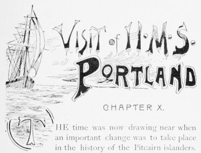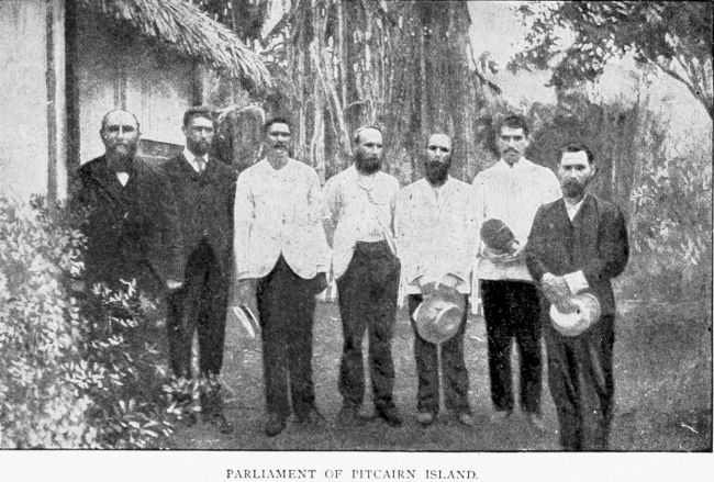 The civil government of the island differs somewhat to what has been the custom for years. When the Champion, man-of-war, visited the island in October,[252] 1892, Captain Rooke presided at a meeting convened to consider some questions, civil and religious, acting as regards the former agreeably to the opinion of the British Consul at Tahiti, with whom he had consulted when on the eve of leaving Tahiti for Pitcairn Island.