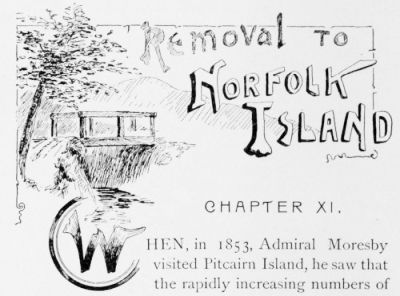 The present work is written by a native of the island, and one who has practically spent her whole life on the island, a few years of her childhood only having been spent on Norfolk Island. While her lifetime does not cover quite one-half of the time covered by the history of the island, she had access for many years to one at least who remembered events that occurred before the beginning of the present century. The author’s father was the second oldest man of the community at the time of his death, in September, 1893, and was a grandson of John Adams, one of the mutineers of the Bounty, whose death took place in 1829. She has thus had the best of advantages for obtaining a correct knowledge of the island history.