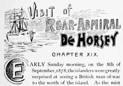 Several trips were made to and from the wreck by the islanders, and even several of the women accompanied their husbands and brothers in their last trip in open boats to Oeno. All returned in safety, no accident having occurred either going or returning, as the weather continued fine. This was in June, the month of vacation. The month following H. M. S. Hyacinth[244] came, and during her short stay several cases of sickness were attended by the doctor, who pronounced the disease to be a form of la grippe. Some of the persons who were suffering at that time had their lives despaired of, but all of them eventually recovered.