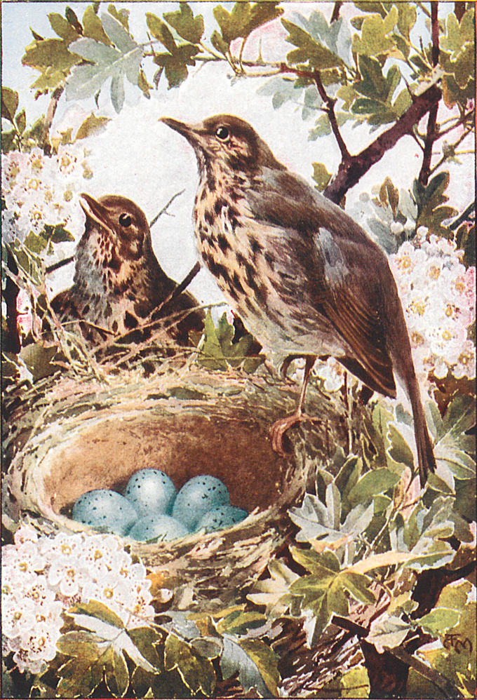 Auch die Nester und die jungen Vögel sind zu beobachten. Man braucht dabei die Nester nicht auszunehmen oder den Vögeln ihre Eier zu rauben. Viel mehr lernt man dadurch, daß man Blätter und Zweige vorsichtig zurückbiegt und in das Nest sieht. Denn so kann man oft[S. 10] wiederkommen und beobachten, wie die Jungen auskriechen, und wie sie wachsen. Wenn man vorsichtig ist, den Busch nicht heftig bewegt und die Eier nicht anfaßt, wird die Mutter sie nicht verlassen. Im letzten Jahre baute ein Drosselpärchen sein Nest in einer Hecke neben einem Fußwege, wo fortwährend Leute vorbeigingen. Aber obwohl ich oft hinging und es betrachtete, zog die Mutter ihre vier Kleinen alle auf. Sie pflegte ruhig auf dem Neste sitzen zu bleiben, wenn ich hineinsah, während das Männchen auf einem ganz in der Nähe stehenden Baume sang.