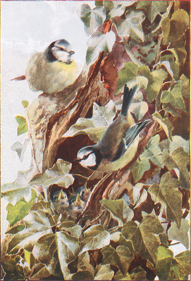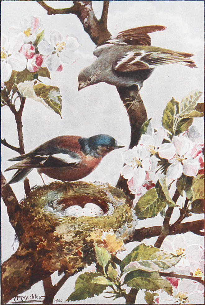 Im Frühling singen die Vögel am meisten; denn dann bauen sie ihre Nester, und das Männchen singt dem Weibchen etwas vor, während dieses beim Bau beschäftigt ist oder auf den Eiern sitzt. Man kann ein Rotkehlchennest manchmal dadurch ausfindig machen, daß man das Männchen beobachtet, wie es singend auf einem Zweige in der[S. 13] Nähe sitzt. Die meisten haben wohl auch schon eine männliche wilde Taube gesehen, wie sie dasitzt, ihre Kehle aufbläst und girrend und sich verbeugend nach dem Weibchen auf dem Neste schaut; denn Tauben machen sich das ganze Jahr hindurch den Hof. —