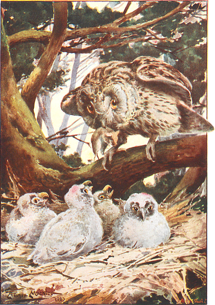 Achte auch auf den Unterschied in der Stellung der Augen. Ein Falke hat die Augen an den Seiten des Kopfes, aber die Eule hat sie vorn im Gesicht wie du und ich. Wenn sie also in der Dämmerung jagt, so kann sie alles, was in ihre Nähe kommt, genau betrachten. Sie kann die Pupille des Auges stark erweitern wie die Katze, um alles vorhandene Licht darin zu sammeln. Ihre Federn sind so weich und daunenartig, daß sie beim Fliegen kein Geräusch macht, auch hat sie große unter Federbüscheln verborgene Ohröffnungen, die durch ein Häutchen verschlossen werden können. Da dieses beim Fluge geöffnet wird, fängt das Ohr den Schall gut auf, und die Eule hört infolgedessen das leiseste Geräusch. Einige Eulen haben Federbüschel, die wie ein Katzenohr in die Höhe stehen.