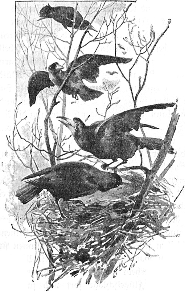 Habt ihr jemals beobachtet, wie gravitätisch eine Saatkrähe über das Feld schreitet? Sie hüpft nicht wie eine Drossel oder ein Sperling, sondern setzt einen Fuß vor den anderen und macht dann und wann einen kleinen Sprung. Einige bleiben stets in der Nähe auf Bäumen sitzen, um bei Gefahr zu warnen, und wenn diese Wachen „Krah, Krah“ schreien, erhebt sich der ganze Schwarm. Sie fliegen mit langsamem Flügelschlage fort und fallen in ein benachbartes Feld ein.