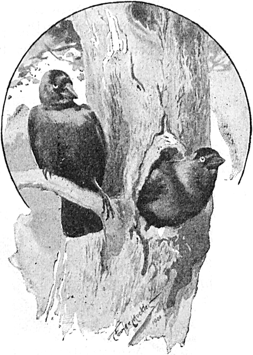 Obgleich Saatkrähen nie anderen Vögeln ihrer Art erlauben, sich zu ihnen zu gesellen, leben sie mit Dohlen in tiefer Eintracht zusammen und dulden auch zeitweise Stare unter sich. Eine Dohle bewegt sich ziemlich ebenso wie eine Krähe, obwohl sie ein lebhafterer Vogel ist. Sie ist kleiner und hat einen grauen Nacken. Der Star (siehe Seite 44) ist ein Wandervogel. Obgleich sein Kopf und Rücken schwarz sind, hat er doch namentlich im Frühling so viele helle Farben auf den Federspitzen, daß er nicht dunkel aussieht wie Saatkrähe und Dohle, sondern bunt und glänzend.