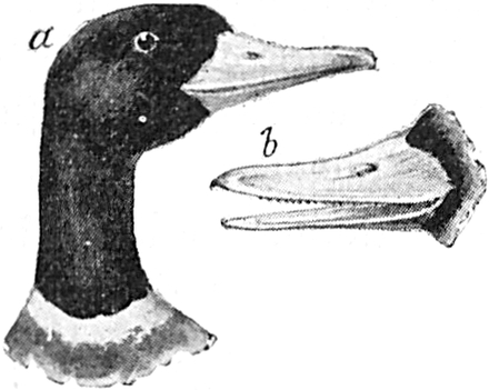 Hat man aber diese mit Schwimmfüßen versehenen Vögel noch nicht gesehen, nicht einmal eine wilde Ente, so kennt doch jedes Kind die zahme Ente, die auf unseren[S. 62] Bauernhöfen gezüchtet wird. Unsere Enten wurden vor langer langer Zeit aus wilden Enten gezähmt und sind ihnen sehr ähnlich. Wir wollen sehen, was wir über sie lernen können.
