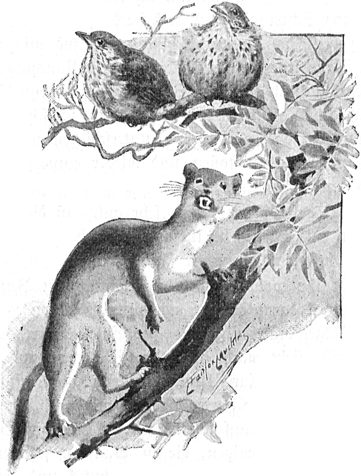 Habt ihr wohl, wenn ihr behaglich im Bette liegt, schon einmal daran gedacht, wie viele Gefahren es für die kleinen Vögel draußen gibt? Die Eule, die an der Hecke umherstreift, sieht nach brütenden Weibchen und jungen Vögeln aus. Die Katze klimmt vielleicht am Baum empor und faßt mit ihren scharfen Krallen ins Nest. Wiesel und Iltis machen Jagd auf alle Vögel, die dicht am Erdboden oder selbst auf diejenigen, die in Bäumen schlafen, und Schlangen fressen gern Eier zum Frühstück und lieben sie ebenso sehr wie wir.