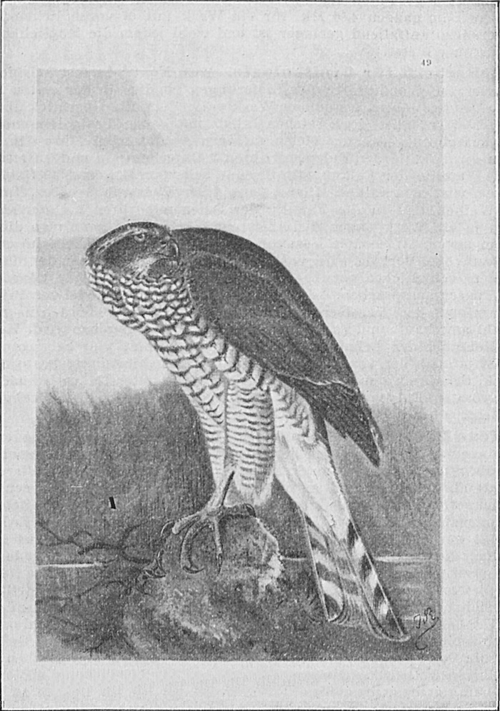Ein anderer gemeiner Falke ist der Sperber, welcher dunkelgraue Flügel hat und eine gelblichweiße Brust mit braunen Querstreifen. Er rüttelt nicht, sondern streicht an den Hecken entlang auf der Suche nach Vögeln und Mäusen. Er richtet sehr großen Schaden an, da er ein großer Räuber unter den Singvögeln und dem Nutzgeflügel ist. Aber er ist auch nützlich, indem er Mäuse und Insekten vernichtet und verhindert, daß die kleinen Vögel, die Korn fressen, zu zahlreich werden. Das Weibchen dieses Raubvogels ist größer als das Männchen.