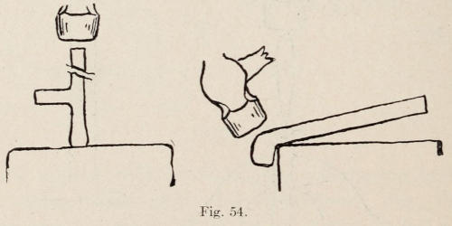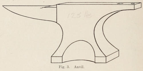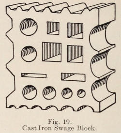 Figure 18 shows a wrought vise suitable for school work. A cast iron machinists’ vise should not be used excepting, perhaps, for bench work. Figure 19 shows a cast-iron swage block with various sized holes, and depressions around the edge for forming iron.