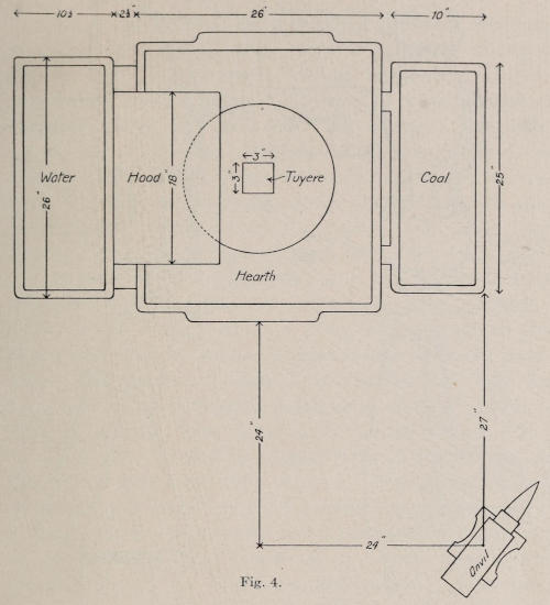 The anvil should be of wrought iron with a steel face, weighing about 125 pounds. This is large enough for any work being done in manual training schools. In the school shop the anvils should all be of the same size and weight so that any tool used with them will fit into any square hole. In factories where anvils are made, they are forged from wrought iron or soft steel, with a carbon steel face welded on; some are cast steel thruout and others are cast iron with a steel face. The face is generally three-quarters inch thick, and is hardened[11] to resist heavy blows from the hammer and sledge. (See drawing Figure 3 of anvil.) The anvil should be fastened with iron straps, on a 10 by 10-inch block, set into the ground about 3½ feet. From the top of the anvil to the floor should measure 26 inches. The proper place to set the anvil in relation to the forge is shown in the drawing, Figure 4. The smith should stand between the forge and the anvil, with the horn of the anvil at his left when facing it. The anvil edge farthest from the smith is called the outer edge and the one nearest the smith is called the inner edge.