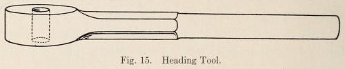 A heading tool is made from a flat piece of soft steel with a hole in one end. Sometimes a carbon steel face is welded on. The heading tool is used mostly[16] in heading bolts. Heading tools are made with different sized holes. (See Figure 15.)