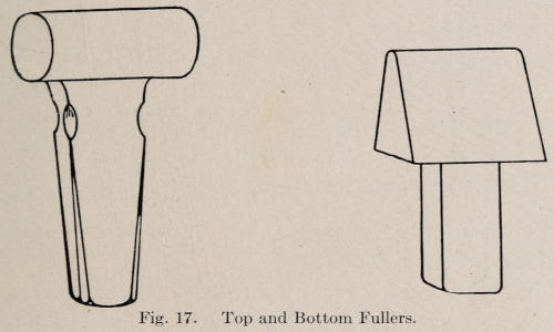Swages and fullers are used to smooth and form iron into various shapes. The swages generally have half round depressions in them. They are made in pairs called top and bottom swage. The bottom one fits the square hole of the anvil; the top one has a hole for a wooden handle. (See drawing Figure 16.) The fullers are also made in pairs called top and bottom fullers. They are used to make depressions in metal. (See drawing Figure 17.) When referring to swages, fullers, and other tools of this character, blacksmiths speak of anvil tools. Special anvil tools are used in doing various kinds of forging, and are made when needed. The anvil tools should be kept in a tool rack next to the anvil. These tools should be made from tool-steel of about 75-point carbon, or they may be[17] purchased from a dealer. Some tools, such as swages, that do not require continuous service, are made of soft steel.