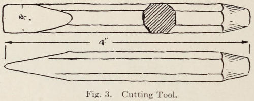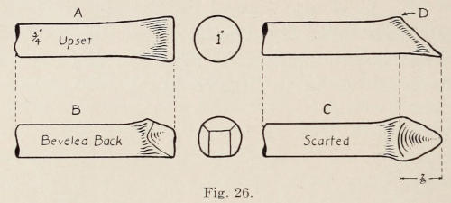 The anvil tool should have a buggy-spoke for a handle. The handle should stick thru the eye of the hole about one inch and should never be wedged. If the handle is wedged it is more liable to be broken when the tool is struck a glancing blow with the sledge hammer. This is very often the case. The reason the spoke should stick thru the tool is that if it should begin to work off the handle when struck with the sledge hammer, the movement can be seen.