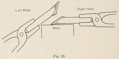 The stock used in a forge shop should be kept in a rack built for the purpose. The different kinds of stock, such as soft and tool-steel, common and Swedish iron, should be partly painted with a distinguishing[18] color, so that there will be no trouble finding what is wanted. For instance, all soft steel should be painted white, tool-steel another color, and so on. There should also be in the shop a shears to cut iron. One of the ordinary hand-power shears in use today would be suitable and may be purchased from a dealer.