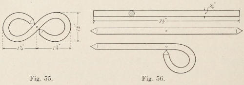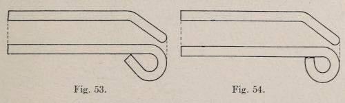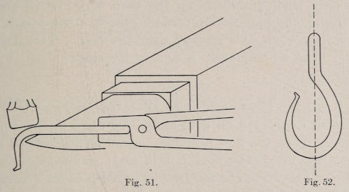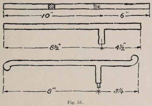 The hook is made from iron. Figure 51 represents the dimensions of stock for the hook. The lug is welded on, and the ends of the bar are rounded ready to be formed. After the stock is cut, it is upset six inches from one end to enlarge it so that the lug can be welded on. The stock from which the lug is made is cut 3½ inches long, upset on end, and split in the vise ½ inch deep as shown at Figure 52. The split end should be formed as shown. In welding, separate heats are taken, and the lug is jumped onto the bar as shown in Figure 53. The first blows are struck directly on the end of the lug, then the lips are welded. Figure 51 shows the length[121] of the piece before the knobs are formed. In making the knobs at the end, they should be upset as shown in Figure 54. They are then hammered as shown, and finally rounded. The lug is next cut the proper length, and a shoulder is filed at the end. The chased lines are now cut on the front side. In forming the piece, it is heated and hammered over the horn of the anvil,[122] starting to bend at the end first, and working toward the center. In bending anything of this kind, always start at one end, and finish as you work toward the other end. See the drawing of the bent hook at Figure 55. The end of the lug is next heated and caught in a vise, the plate is set on and riveted tightly. The work is smoothed with a file, heated to darken it, and oiled.