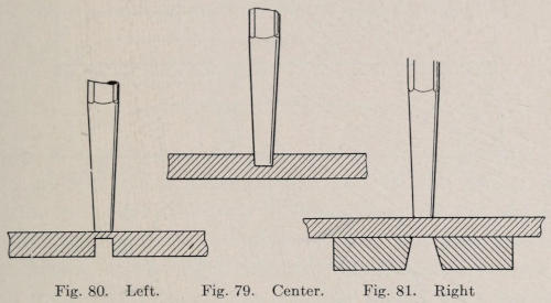 A wider punch is now used in the long channel to straighten it and make it deeper. The wide punch should have no taper and should be a scant ³⁄₃₂ in. thick so that the line will be about ³⁄₃₂ in. wide. If any part of the channel should be too wide, the handle should be hammered on the edge with a light hammer to close the channel a little. When the channel is finished, the handle should be filed flat on the channel side. This will give one a better view of the straightness of the channel.
